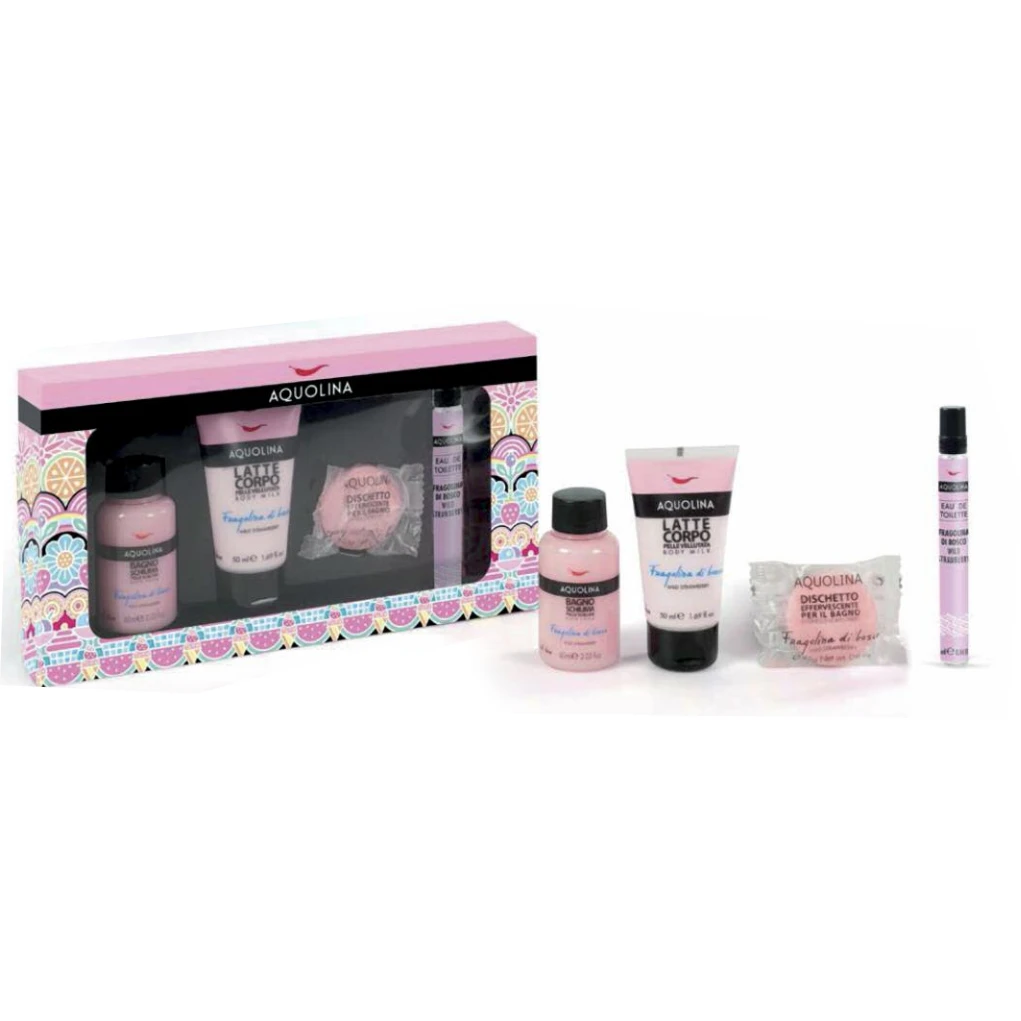 Aquoina cofanetto MOUSSE TEXTURE GOLOSE FRAGOLINA DI BOSCO CHE COMPRENDE: BAGNOSCHIUMA 60ml + LATTE CORPO 50ml + PROFUMO DA BORSETTA 10ml + DISCHETTO EFFERVESCENTE