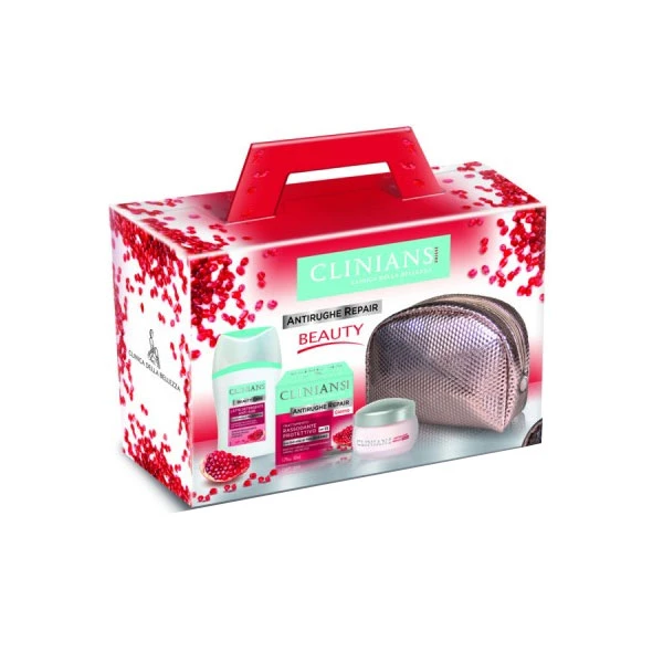 Clinians antirughe repair beauty confezione pochette + crema giorno rassodante protettivo 50 ml + latte detergente anti age 150 ml.