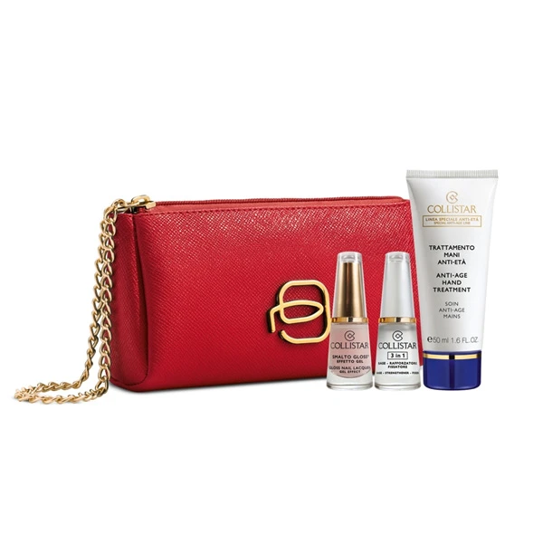 Collistar – Cofanetto Smalto Gloss Effetto Gel 511 + 3in1 Base Rafforzatore-fissatore + Trattamento Mani Anti-eta’ 50 Ml + Pochette Piquadro