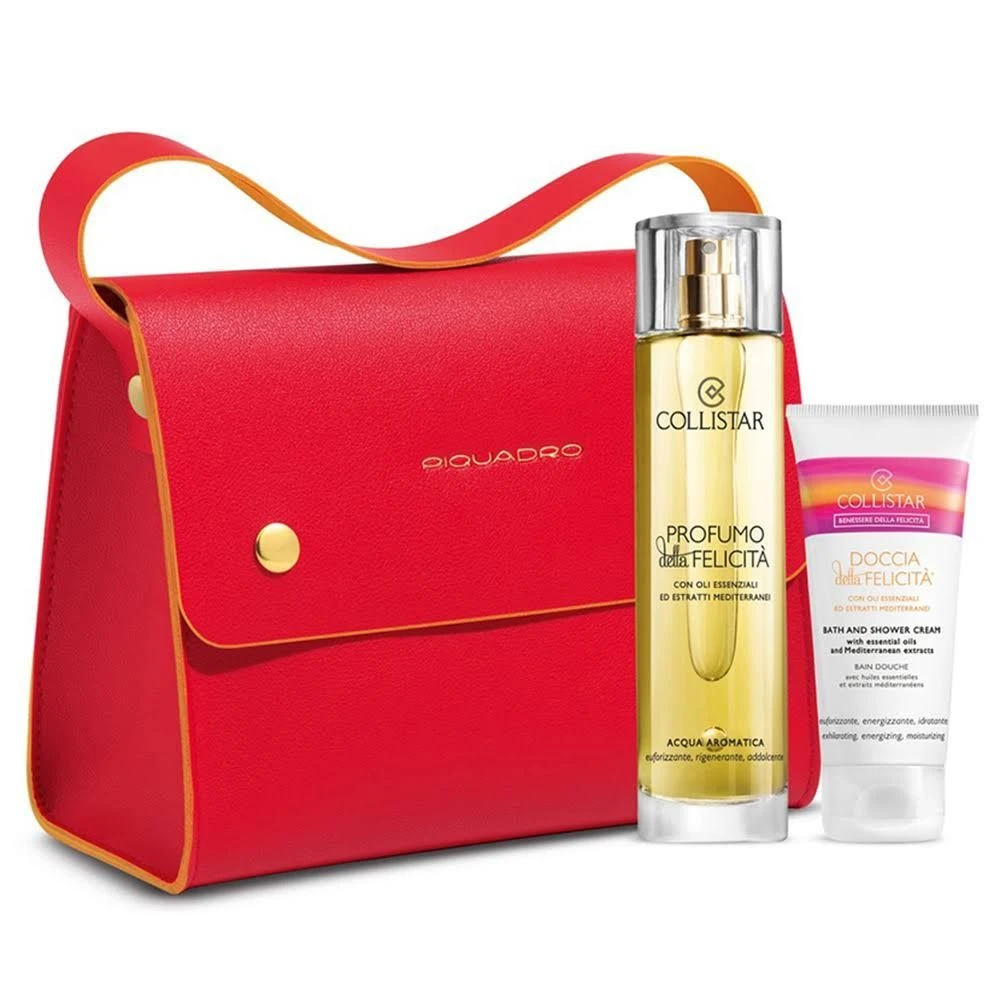 Cofanetto contenente: Profumo della Felicità 100ml, Doccia della Felicità 50ml, borsa Piquadro rosso geranio con profili arancio.
