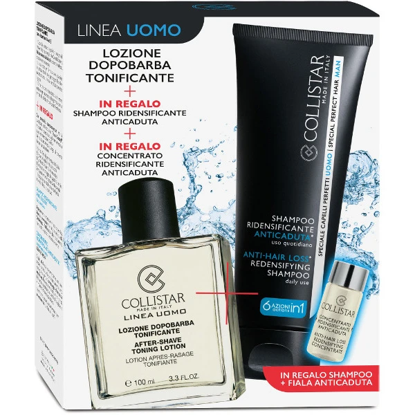 COLLISTAR – Lozione Dopobarba Tonificante PROMO – 100 ml Dopobarba + 100 ML Shampoo Anticaduta + 6 ML Fiala Anticaduta. Stimolante e delicatamente alcolica, la sua speciale formula con vitamine ed estratti vegetali rivitalizza, tonifica e protegge l’epidermide lasciandola fresca e morbida per tutto il giorno. Oltre che come dopobarba, questa lozione può essere usata in ogni momento della giornata per una sferzata di vitalità e tonificante freschezza.