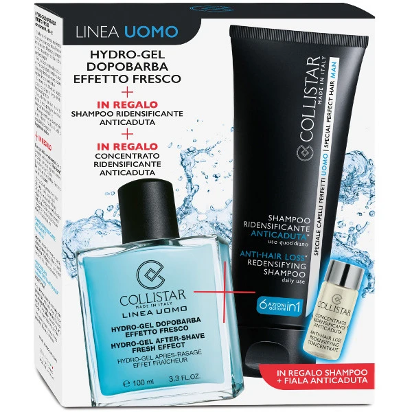 Collistar – Hydro-Gel Dopobarba Effetto Fresco PROMO – 100 ml Dopobarba + 100 ML Shampoo Anticaduta + 6 ML Fiala Anticaduta. Grazie alla sua particolare texture questo dopobarba risulta leggero e di immediato assorbimento. Leggermente alcolico conferisce alla pelle, subito dopo la rasatura, un intenso senso di benessere e freschezza.