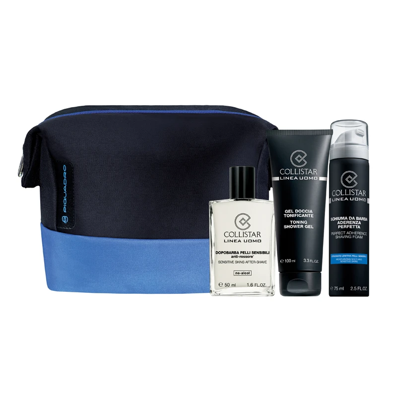 COLLISTAR UOMO REF.4141 Confezione Contenente: Dopobarba Pelli Sensibili Anti-Rossore 50 ml Schiuma da Barba Aderenza Perfetta Pelli Sensibili 75 ml Gel Doccia Tonificante 100 ml Travel-Bag Piquadro
