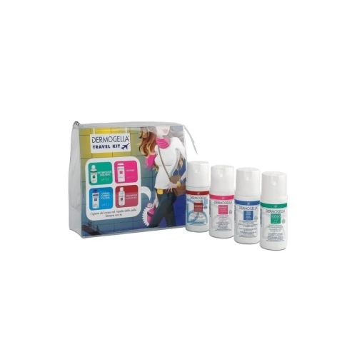 Con DERMOGELLA TRAVEL KIT puoi portare con te tutta la sicurezza dei prodotti Dermogella nel pratico formato da viaggio da 100 ml*. Il Dermogella Travel Kit contiene: DETERGENTE LIQUIDO pH 4,5: deterge e idrata delicatamente tutto il corpo, donando benessere e freschezza per tutto il giorno. A base di estratti naturali di Salvia e Camomilla, è ideale per la detersione di tutti i tipi di pelle. DETERGENTE INTIMO pH 4,5: deterge con delicatezza, nel rispetto della flora batterica vaginale. Con Acido Lattico, estratto di Giglio Bianco e Proteine dell?Avena che assicurano una fresca sensazione di pulito. CREMA CORPO FLUIDA pH 5,5: crema a base di Mandorle Dolci e Vitamina E, idrata la pelle in profondità e svolge una spiccata azione emolliente e rinfrescante. SHAMPOO VITAMINS: shampoo per capelli normali, adatto a lavaggi frequenti. Assicura un’azione protettiva e ristrutturante del capello. Ideale per tutta la famiglia.