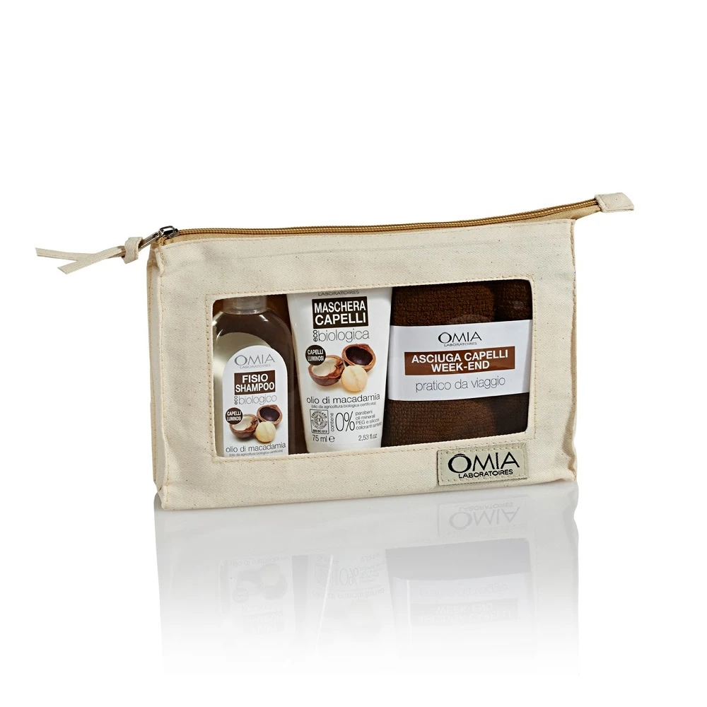 Omia presenta L’eco bio hair care in formato da viaggio. La pochette 100% cotone contiene: Fisio Shampoo da 100 ml, Maschera per capelli da 75 ml e un comodo asciugamano week end.