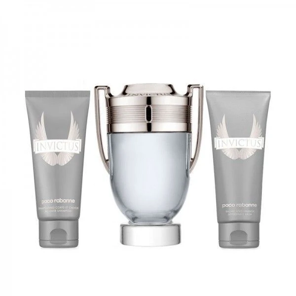 Paco Rabanne Invictus Confezione Regalo 100 ml edt + 100 ml Gel Doccia + 100 ml Balsamo Dopobarba Uomo. Invictus di Paco Rabanne è una fragranza fresca e acquatica maschile. Contiene note di pompelmo, accordi marini, foglia aromatica di alloro, gelsomino ed una base legnosa con legno di guaiaco, patchouli, muschio di quercia e ambra grigia. Invictus si ispira alle vicende sportive delle leggende dei gladiatori romani. Si tratta di una fragranza energetica, perfetta per uomini che praticano sport. Il nome viene dal latino e significa “Invincibile”. La bottiglia è stata disegnata a forma di trofeo.