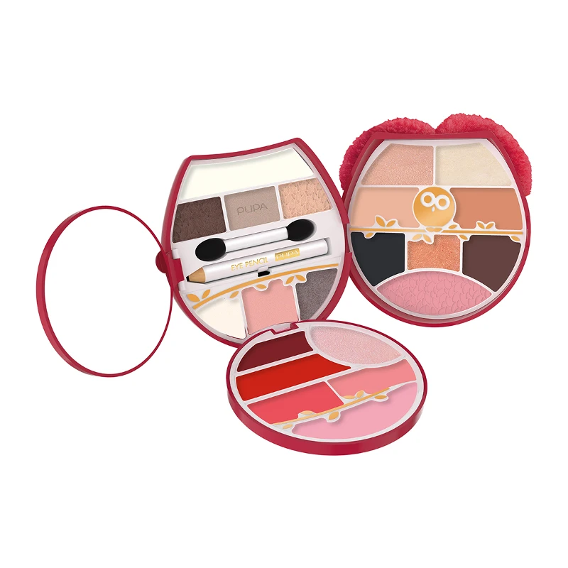 All you need is Make-up, Style, Passion… all you need is Owl! Design esclusivo, dettagli ricercati, personalità unica caratterizzano il Gufo, icona intramontabile che diventa una trousse make-up trendy e irresistibile. Pupa Owl 4 contiene: FACE 1 Blush compatto 2 Correttori 2 All over EYES 1 Primer 7 Ombretti compatti 1 Matita occhi 2 Eyeliner crema 1 Applicatore occhi doppio LIPS 4 Rossetti in crema 1 Gloss 1 Balsamo labbra