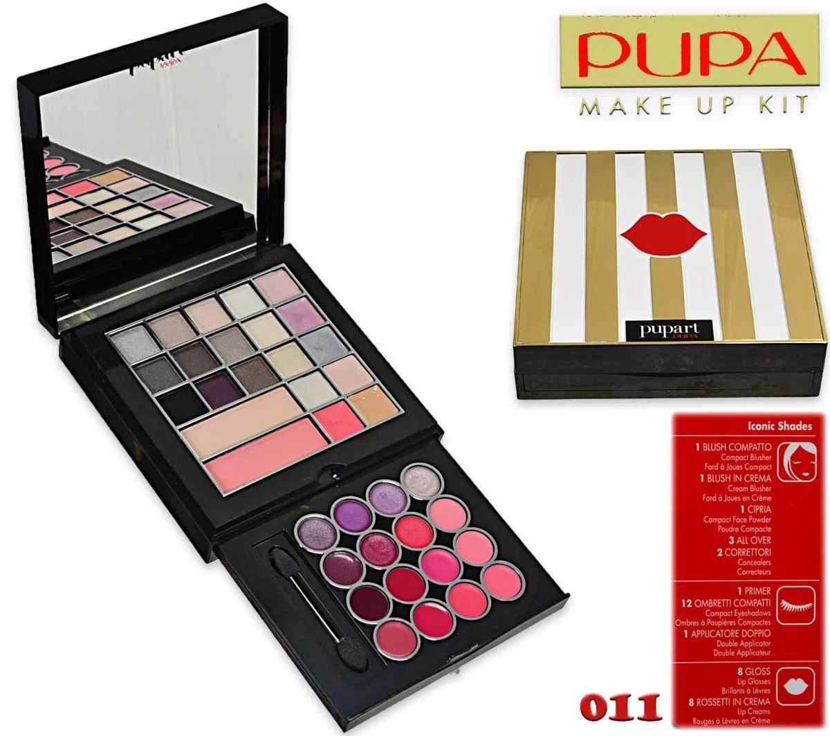 PUPA TROUSSE PUPART M IL BACIO 011 – Contiene: 1 blush compatto, 1 blush in crema, 1 cipria, 3 all-over, 2 correttori, 1 primer, 12 ombretti, 1 applicatore doppio, 8 gloss, 8 rossetti in crema
