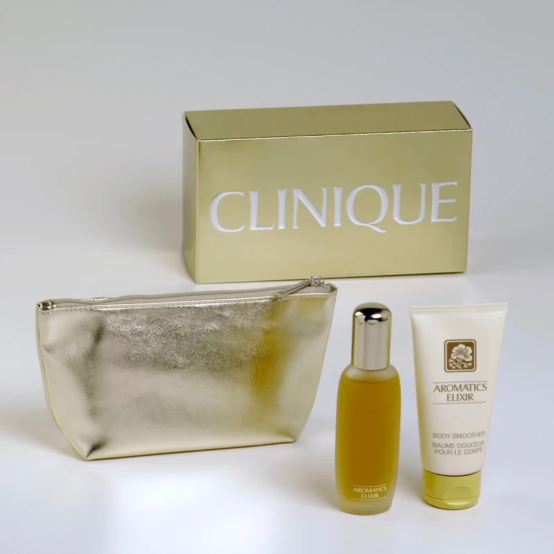 CLINIQUE AROMATICS ELIXIR ESSENTIALS Confezione contenente: Aromatics Elixir Profumo 45 ml spray Lozione Idratante per il corpo Aromatics Elixir 75 ml Trousse Dorata