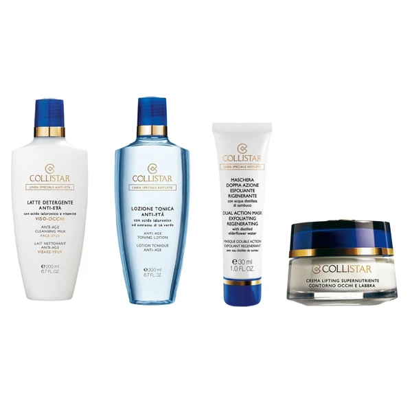 In questo kit, la tua amata riceverà: Collistar Latte Detergente Anti-Età per Viso-Occhi 200 ml Collistar Lozione Tonica Anti-Età 200 ml Collistar Maschera Doppia Azione Esfoliante-Rigenerante 30 ml Collistar Crema Lifting Supernutriente Contorno Occhi e Labbra 15 ml