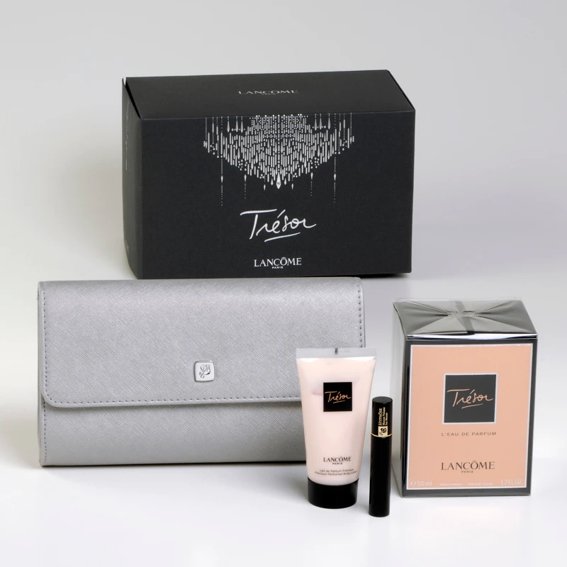 LANCOME TRESOR Confezione Contenente: Lancome Tresor Eau de Parfum 50 ml spray Lait de Parfum Précieux – Latte Corpo Prezioso Profumato 50 ml Mascara Hypnose Noir Hypnotic n. 01 2 ml Trousse