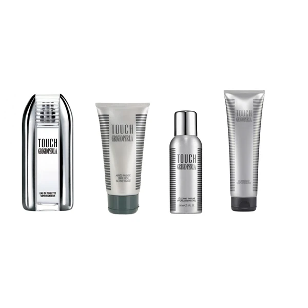 In questo kit, il tuo amato riceverà: Touch Grigio Perla eau de toilette 50 ml spray Touch Grigio Perla Emulsione Dopo Barba 75 ml Touch Grigio Perla Deodorante Spray 150 ml Touch Grigio Perla Shampoo/Doccia per corpo e capelli 300 ml