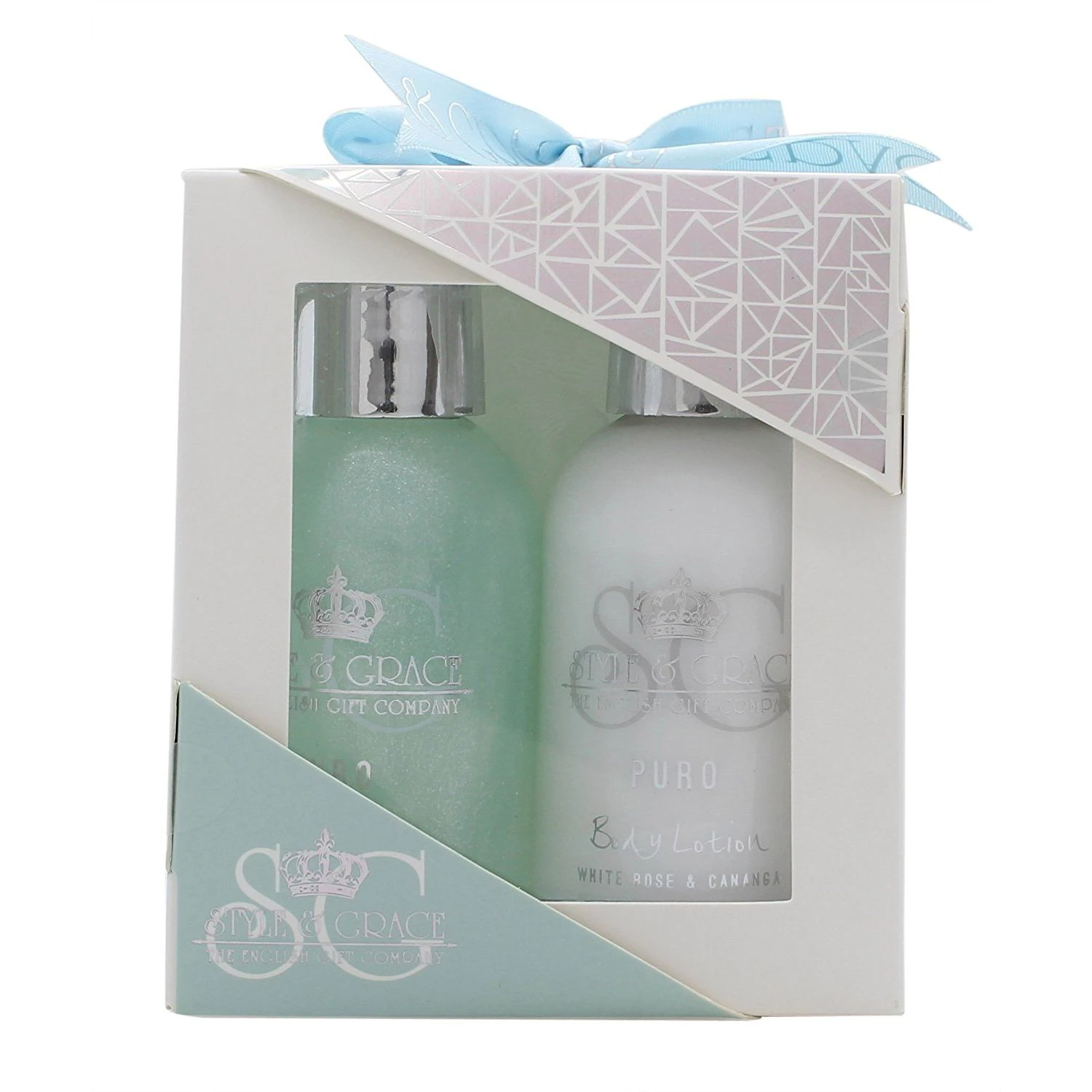 Style & Grace Puro Mini Pamper Treats Confezione Regalo 100ml Bagnoschiuma + 100ml Lozione Corpo + Spugna a Fiore
