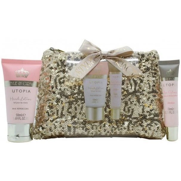Style Grace Set Regalo donna UTOPIA Borsa Glitter Crema mani idratante 50ML+ lucidalabbra 10ML