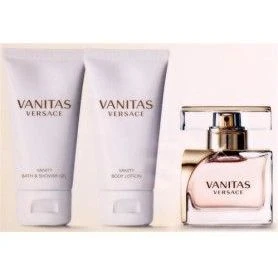 Versace Vanitas Confezione Regalo 50 ml edp + 50 ml Gel Doccia + 50 ml Lozione Corpo Donna. Versace Vanitas è un profumo floreale. La nota di testa è Lime; le note di cuore sono Fresia e Tiarè; le note di fondo sono Cedro della Virginia e Fava Tonka.